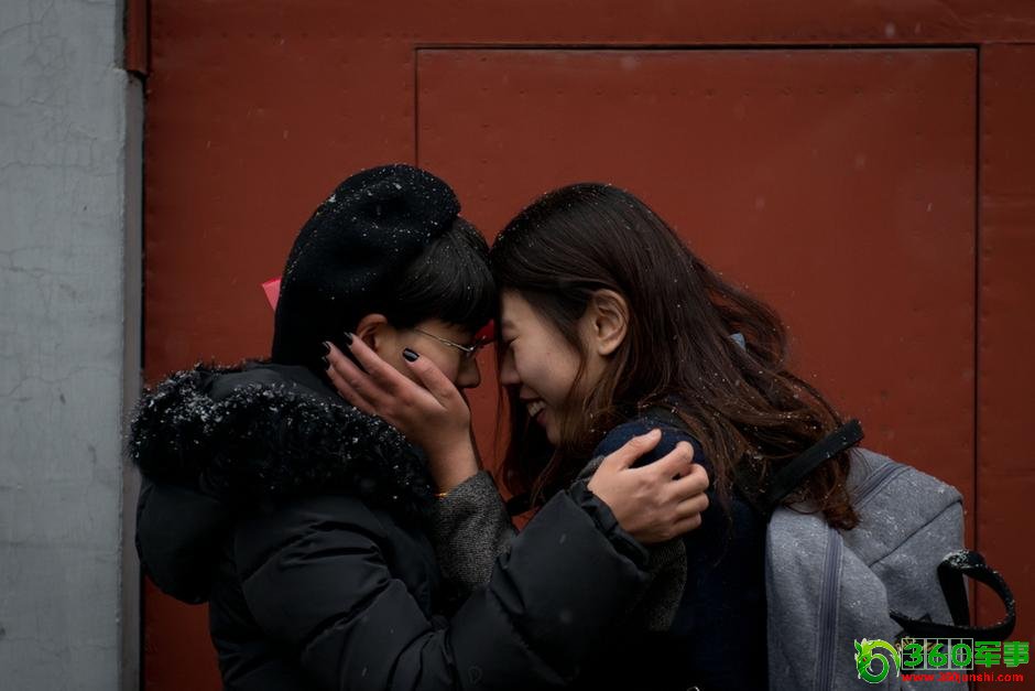 二人在进入婚姻登记处前相互爱抚。
