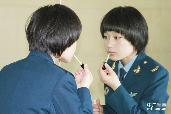 北空某通信总站话务女兵咬筷子练微笑(1)