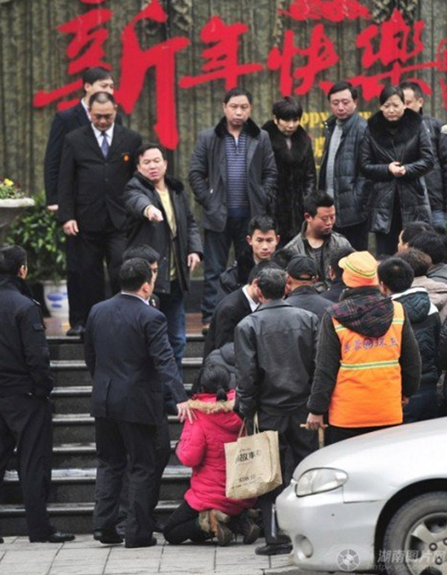 2月19日中午,长沙市八一路富丽华酒店门口,死者王某家属在酒店前讨要说法,随后被保安驱赶离开。