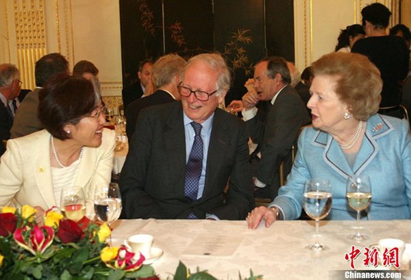 2007年6月5日,英国伦敦,在庆祝香港回归中国十周年午宴上,时任中国驻英大使的傅莹(左一)与英国前首相撒切尔夫人(右一)交谈。