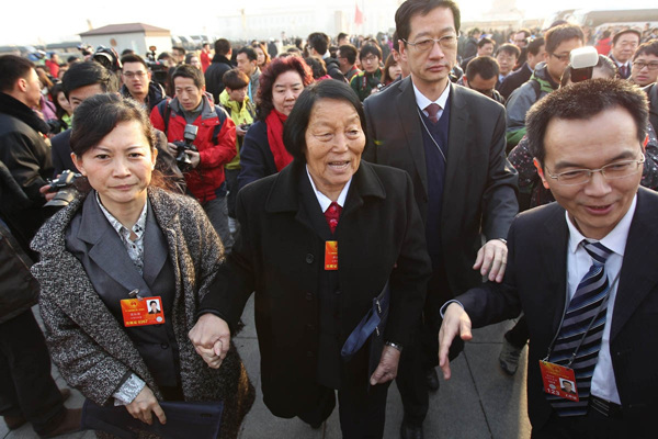3月5日,北京,第一届至第十二届全国人大代表申纪兰和数位代表拉手并排步入会场。