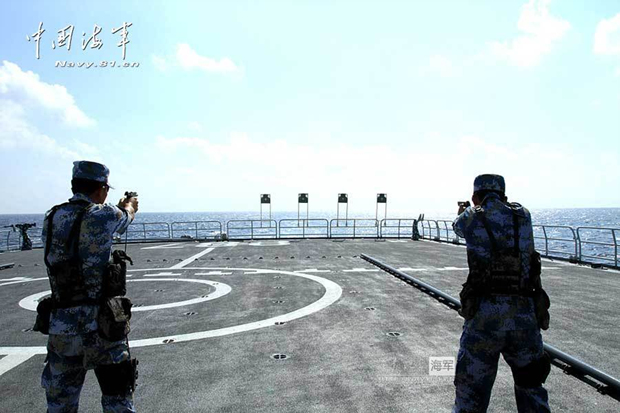 在微山湖舰后甲板,特战队员进行手枪立姿实弹射击。